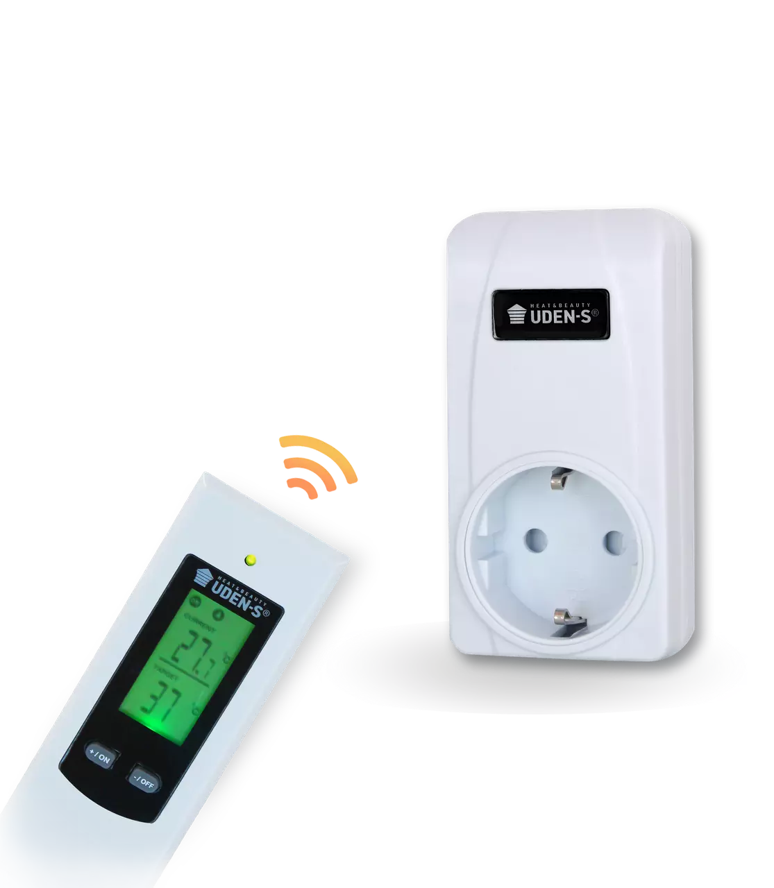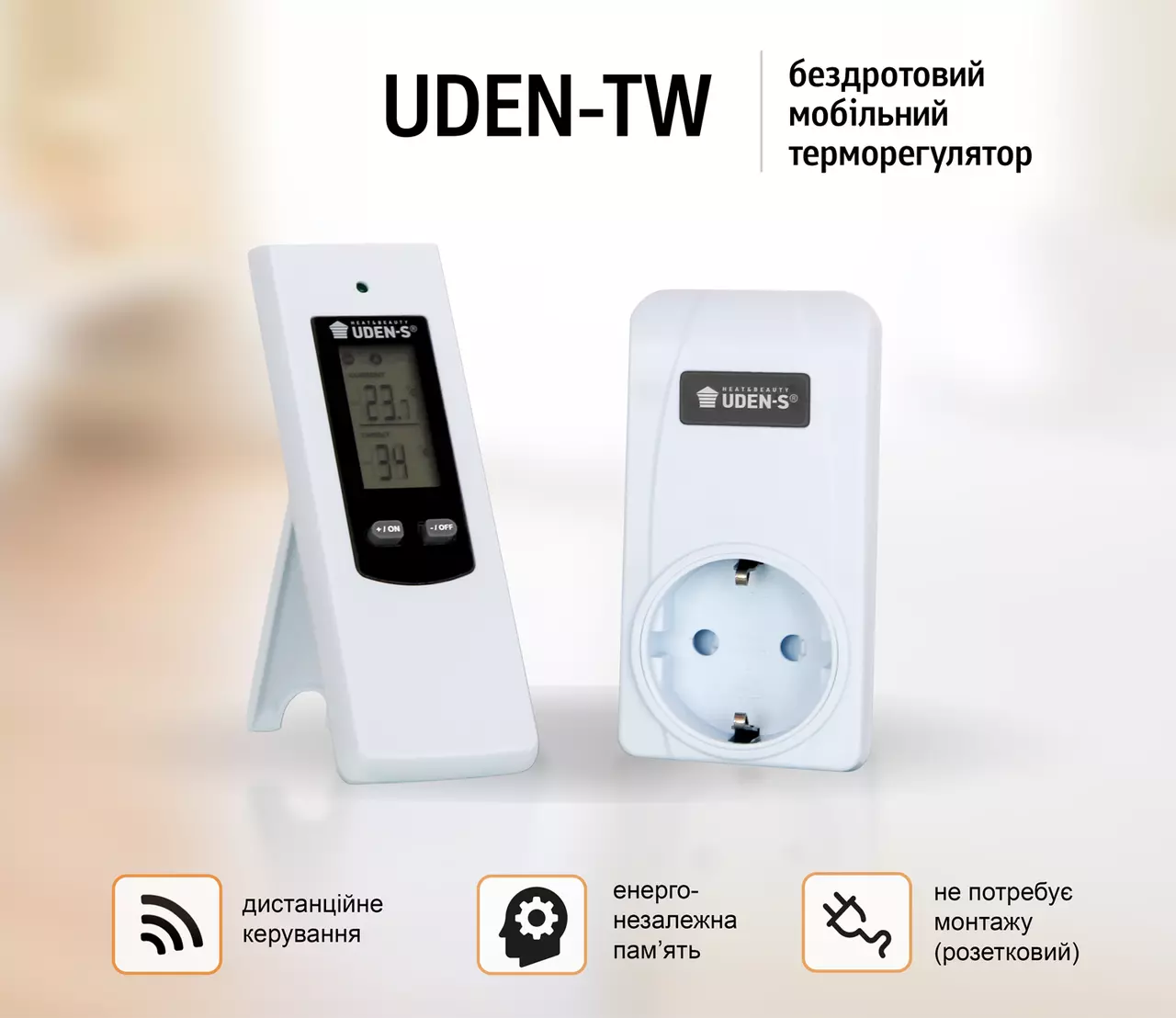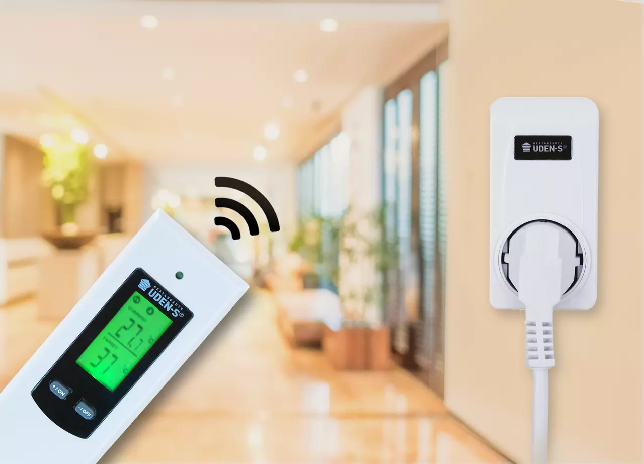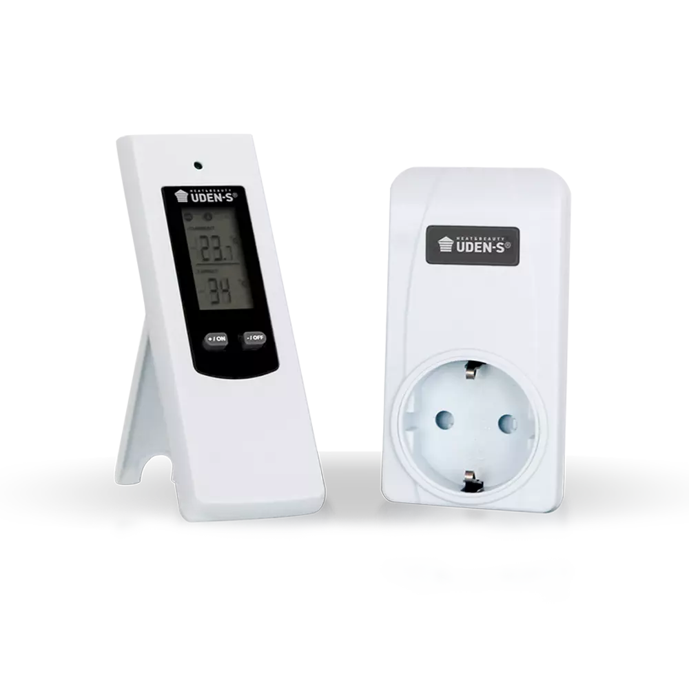 UDEN-TW – бездротовий мобільний терморегулятор для автоматичного керування електричними опалювальними приладами. Застосовується для підключення обігрівачів UDEN-S комплектації «універсал» (зі шнуром і вилкою).